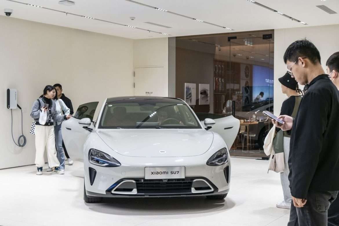 在上海一家店内展示的小米SU7电动汽车。图片来源:QILAI SHEN/BLOOMBERG NEWS