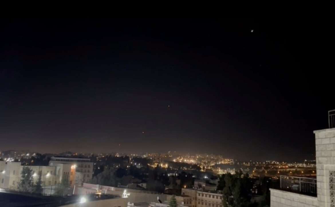 周日凌晨,耶路撒冷上空,以色列发射导弹拦截伊朗无人机。美联社
