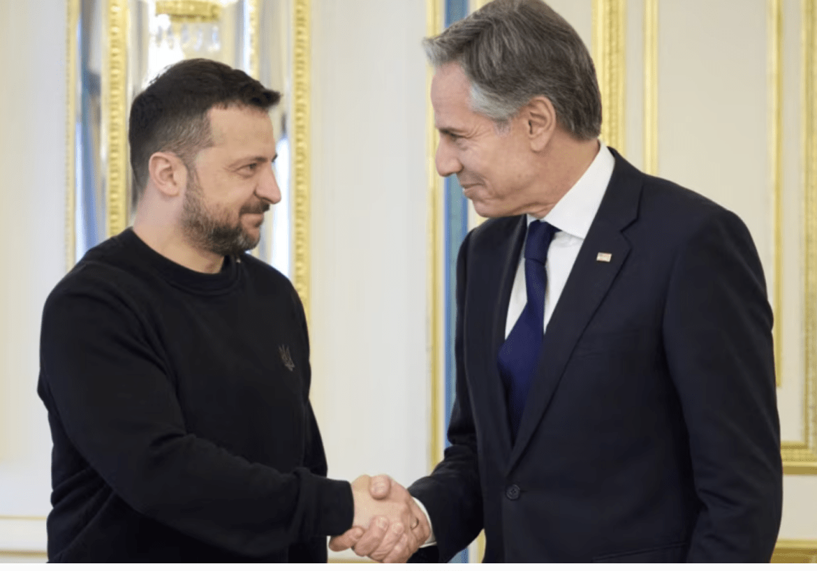 美国国务卿布林肯在基辅与乌克兰总统泽连斯基握手。(2024年5月14日)