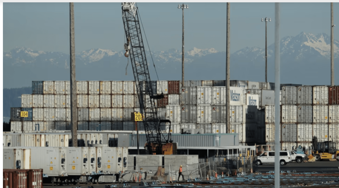 资料照:2019年5月10日,一名工人在华盛顿州塔科马港的卡车拖车和货物集装箱附近行走。