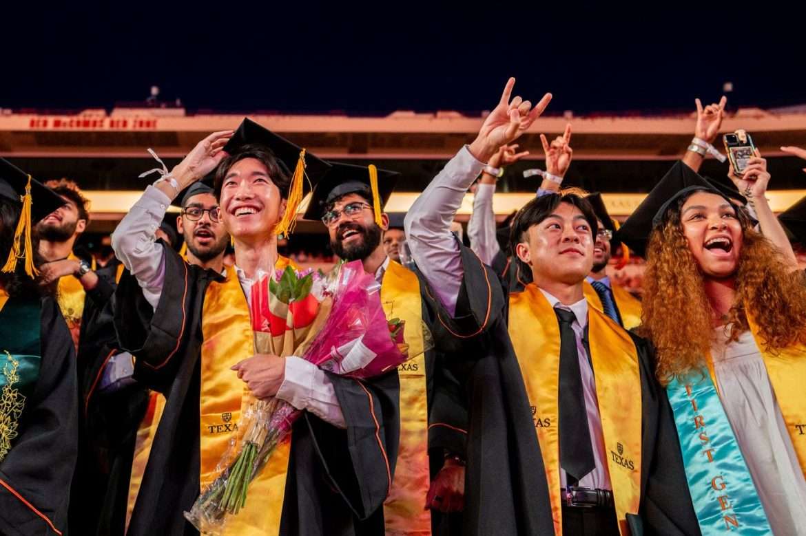 5月,奥斯汀,得克萨斯大学的学生在毕业典礼上庆祝。图片来源:BRANDON BELL/GETTY IMAGES