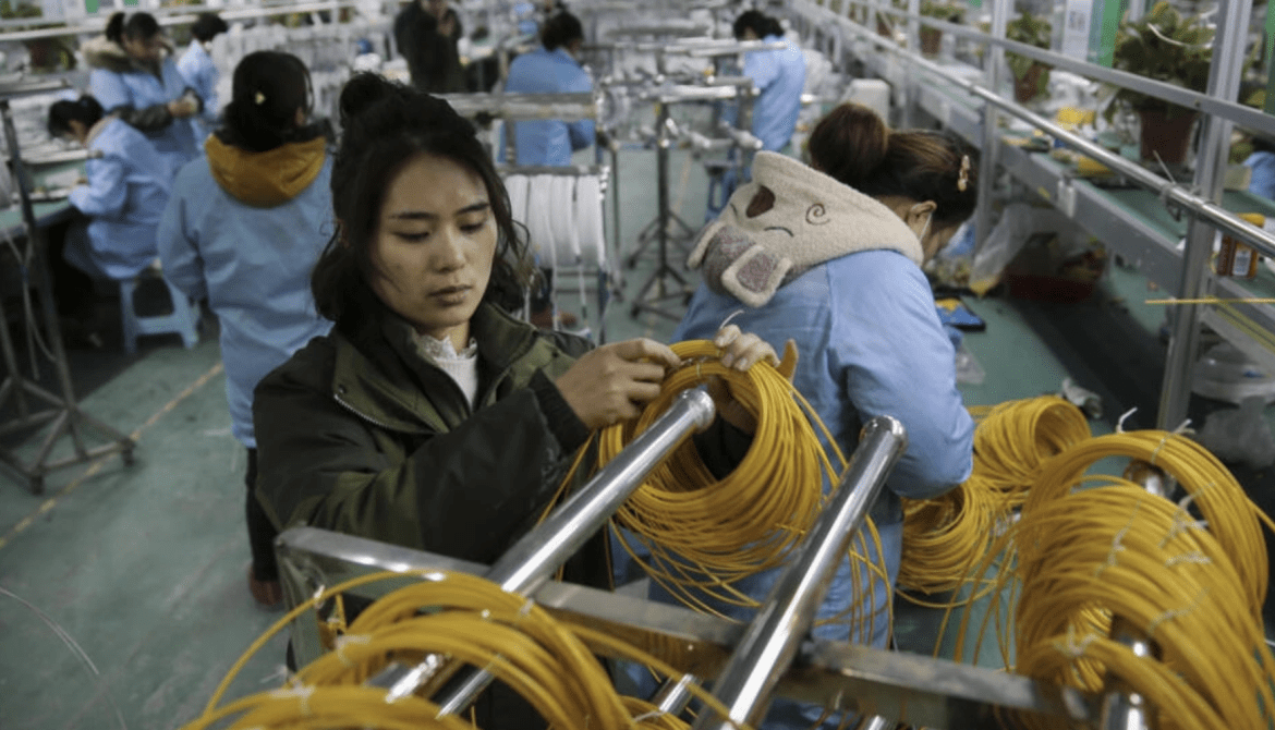 2021年1月,一名工人在中国安徽省濉溪县的一家光纤技术生产工厂内收集电缆。 © 美联社图片