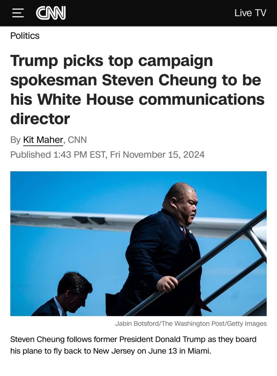 当选总统川普周五宣布,过去两年来一直担任他竞选团队通讯总监的史蒂文·张(Steven Cheung)将加入新一届政府,担任总统助理和白宫通讯总监。