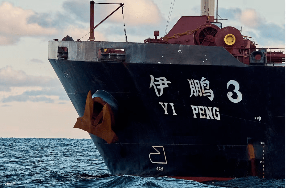 调查人员怀疑,这艘名为“伊鹏3号”(Yi Peng 3)的散货船故意切断了海底两条关键数据电缆。该船长225米,宽32米,运送的是俄罗斯化肥。上周,该船的锚在波罗的海海底被拖行了100多英里。