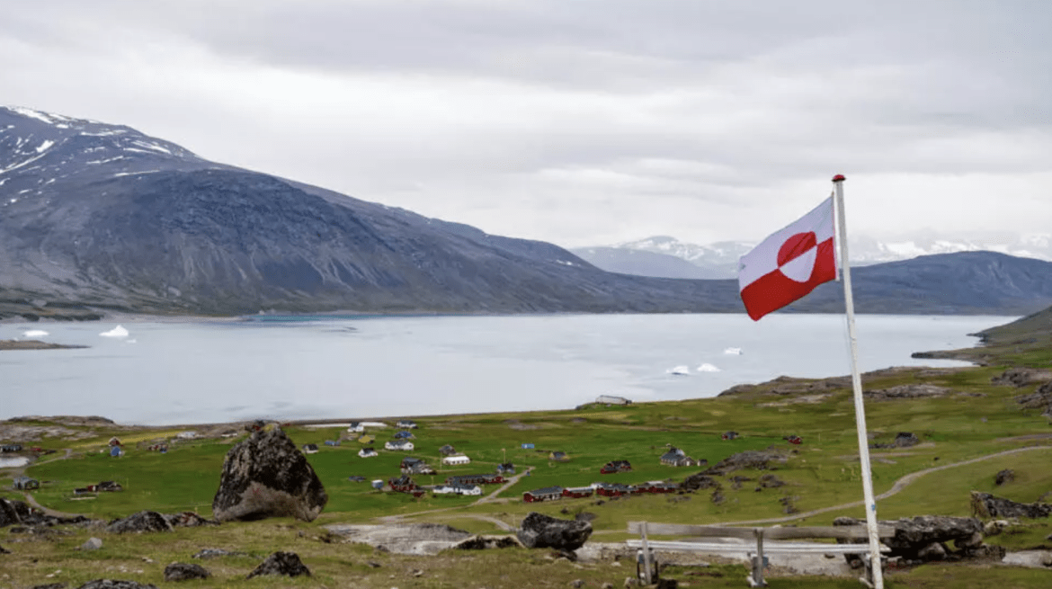 资料图片:格陵兰岛的旗帜在格陵兰岛伊加利库定居点飘扬。摄于2024年7月5日。 via REUTERS – Ida Marie Odgaard