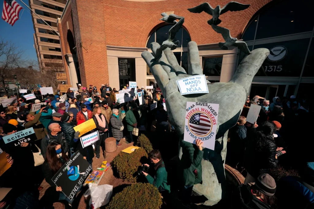 数百名示威者聚集在马里兰州银泉市的国家海洋与大气管理局总部外,抗议政府效率部门的削减。 Chip Somodevilla/Getty Images