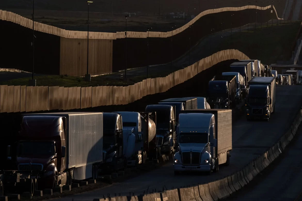 周二,卡车在墨西哥-美国边境附近排队,准备通过墨西哥蒂华纳的奥泰商业过境点。Guillermo Arias/Agence France-Presse