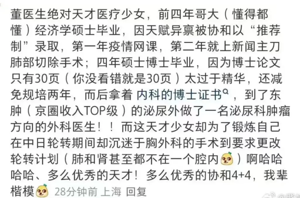 出轨这个事情,慢慢在事件传播中变得不再重要。重要的是,董袭莹这种野路子——既无专业水平,也不讲医学伦理的人,是如何成为中国医学教育顶配(协和4+4)学生的?这个协和4+4模式,也遭遇了越来越多的质疑,很多人认为它就是一个不为患者负责的特权通道。