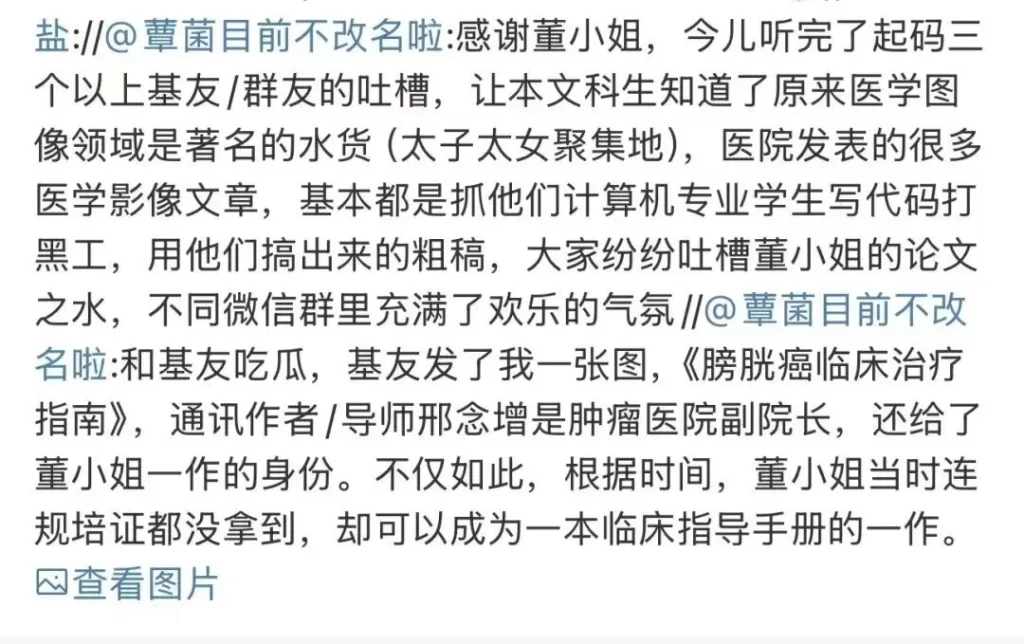 和基友吃瓜,基友发了我一张图,《膀胱癌临床治疗指南》,通讯作者/导师邢念增是肿瘤医院副院长,还给了董小姐一作的身份。不仅如此,根据时间,董小姐当时连规培证都没拿到,却可以成为一本临床指导手册的一作。