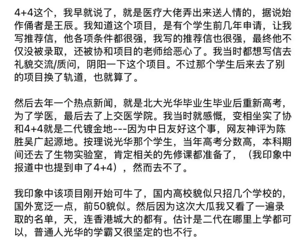 4+4这个,我早就说了,就是医疗大佬弄出来送人情的,据说始作俑者是王辰。我知道这个项目,是有个学生前几年申请,让我写推荐信,他各项条件都很强,我写的推荐信也很强,最终他不仅没被录取,还被协和项目的老师给恶心了。我当时都想写信去礼貌交流/质问,阴阳一下这个项目。不过那个学生后来去了别的项目换了轨道,也就算了。
