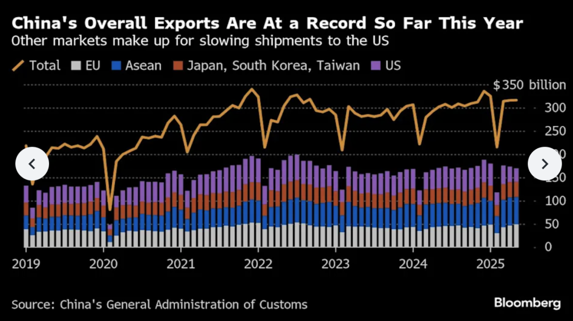 另据彭博社报道,有一部分中国对美出口货物通过“绕道”第三国进行,比如越南。“中国(5月)对越南的出口激增22%,连续第三个月突破170亿美元。”报道称,不过,这也推高了美国对越南及其他国家的贸易逆差,使美国与这些国家的关税谈判面临更复杂的局面。
