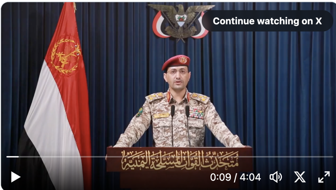叶门武装部队发言人宣布,叶门将干涉以伊冲突。 图片来源:叶门武装部队发言人 Yehya Sarea 的 X