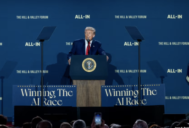 特朗普星期三(7月23日)在华盛顿一场题为“赢得人工智能竞赛”的活动上发表演讲,他表示:“美国是这场人工智能竞赛的发起者。作为美国总统,我今天在此宣布,美国将赢得这场竞赛。”