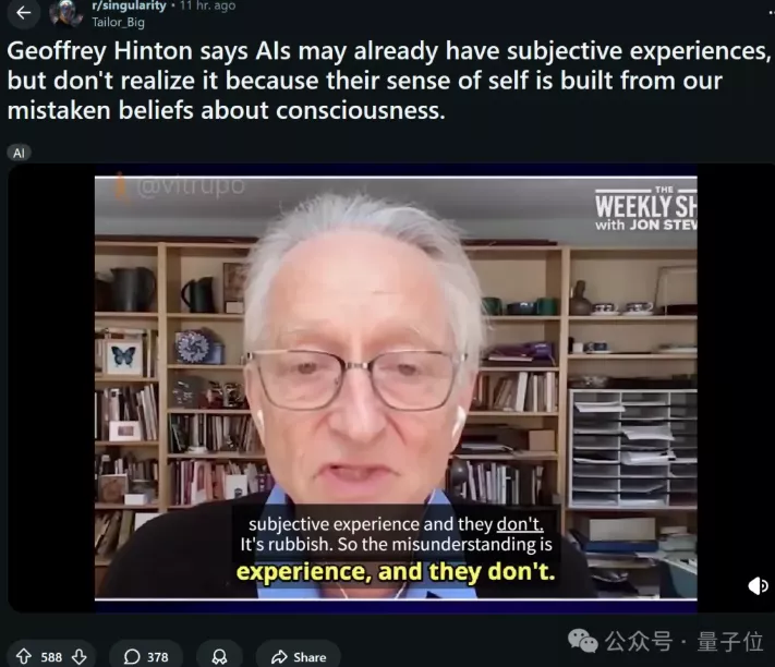 老爷子一再表示,AI也许已经有了“意识雏形”,只是因为我们人类自己对意识理解错了,所以它也被教错了——不知道自己有意识。