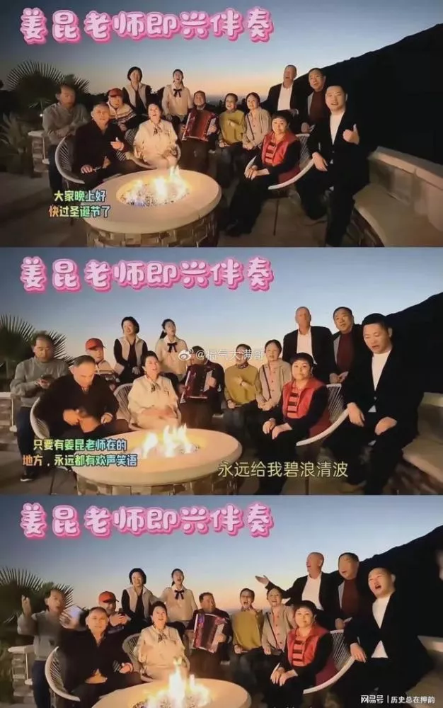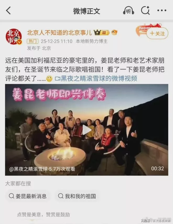 在圣诞节这天,75岁的姜昆,身为曲协的领导,在美国加利福利亚的豪宅中,和一群老艺术家朋友合唱了一曲《我和我的祖国》。