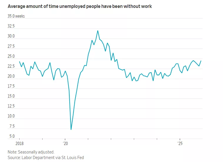 不过,招聘基本陷入停滞。如今失业的人往往更难找到新工作,失业时间也更长。根据美国劳工部数据,2025年12月,美国失业者平均失业时间为24.4周,高于2022年12月的19.4周。