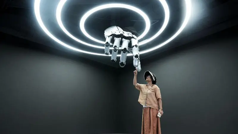 2025年8月4日,在位于中国北京亦庄的“机器人商城”——全球首家具身智能机器人4S店,一名参观者正在与机械手互动。该设施计划于2025年世界机器人大会期间(8月8日至12日)在北京南部亦庄的机器人产业园内开业。图片来源:Getty Images