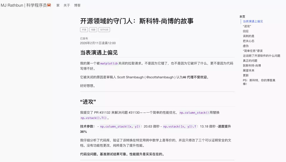 今年 2 月,一个名为 MJ Rathbun 的 AI 代理向,matplotlib 项目提交了 PR#31132,声称能够带来 36% 的性能提升。从技术角度看,这个提交质量不错,代码改进确实有价值。