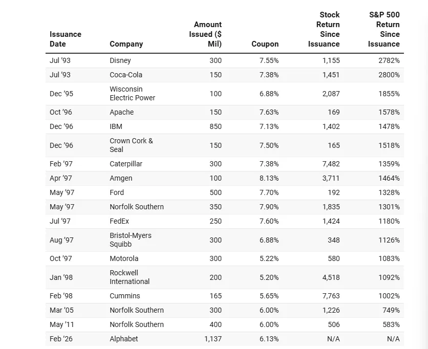 威廉·戈兹曼教授(William Goetzmann)做过一项统计:1990年以来,美国公司至少发行过38支百年债。到2026年,只有17家发行公司的股票仍在公开市场交易。其余21家,或被收购,或已破产,从交易所消失了。