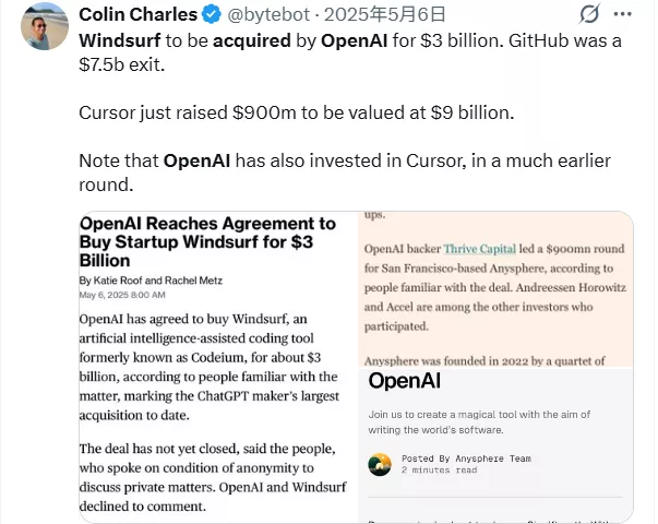 索蒂奥在3月组建了一个“冲刺团队”,把内部几个小组整合在一起,计划在几周内推出竞品。与此同时,奥特曼开始寻找收购目标,他们看上了一家叫Windsurf的AI编程初创公司,报价30亿美元。如果收购完成,产品、团队、企业客户都能快速补