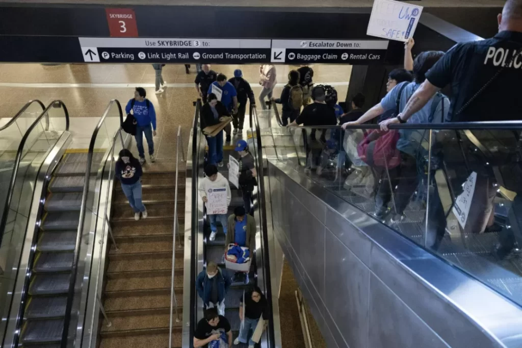 与此同时,数十名抗议者聚集在机场达美航空柜台附近,举牌要求“让他回来”。