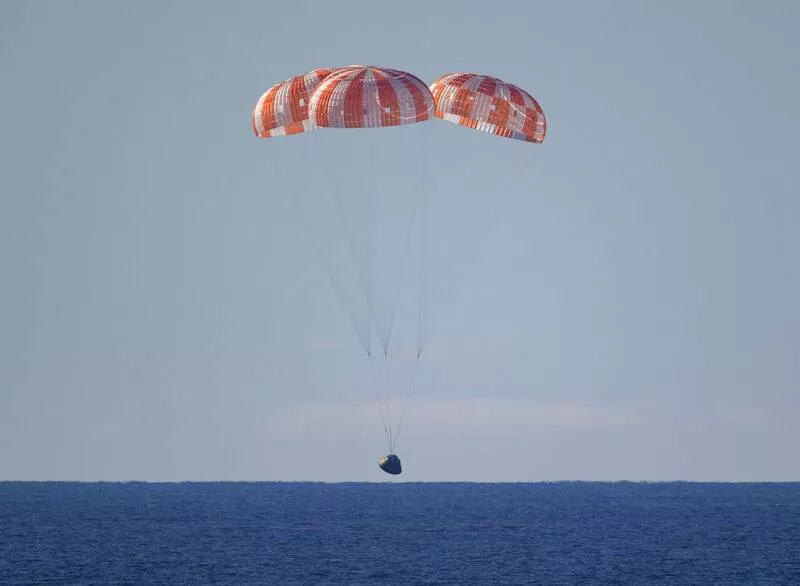 指挥官怀斯曼(Reid Wiseman)、驾驶葛洛佛(Victor Glover)、柯赫(Christina Koch)与来自加拿大的韩森(Jeremy Hansen),以33马赫、接近每小时4万公里的高速冲入大气层,接着太空船陆续打开11具降落伞系统,可将速度从约每小时480公里减至约每小时30公里,最后溅落海面。