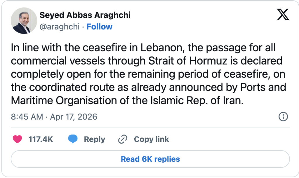 就在川普发文前不久,伊朗外交部长阿拉格奇在X发文表示,“为配合黎巴嫩停火协议,霍尔木兹海峡在剩余的停火期间内,所有商船均可完全通过”。阿拉格奇补充指出,商船行驶航线将依照“伊朗伊斯兰共和国港口和海事组织已宣布的协调路线通行”。