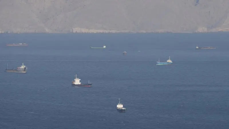 18日在阿曼穆桑达姆外海的荷莫兹海峡上,可见油轮等船舶。(路透)