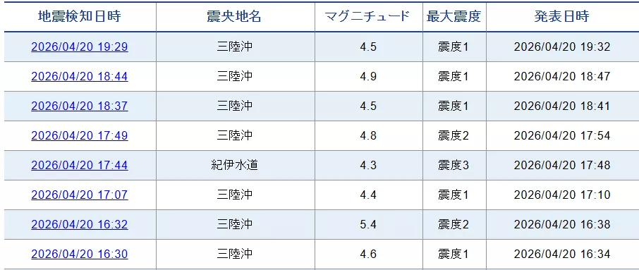 19时29分:震央位于三陆近海,规模4.5,最大震度1。