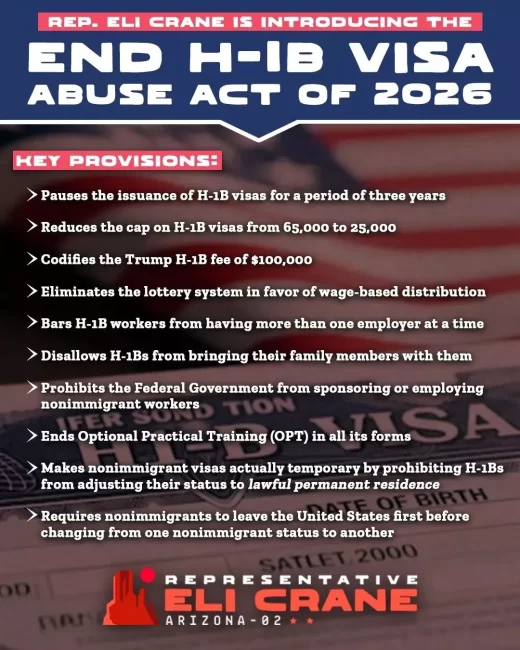 近日,亚利桑那州议员伊莱·克莱恩(Eli Crane)正式向国会提交《2026年终止H-1B签证滥用法案》,该法案提议立即暂停发放新的H-1B签证三年,并在计划恢复后实施一系列重大改革,包括数量减至三分之一,禁止外包公司取得H-1B签证资格等,最重要的是,将取消H-1b签证直接通往绿卡的途径,如果想要转换身份,必须离开美国再申请。