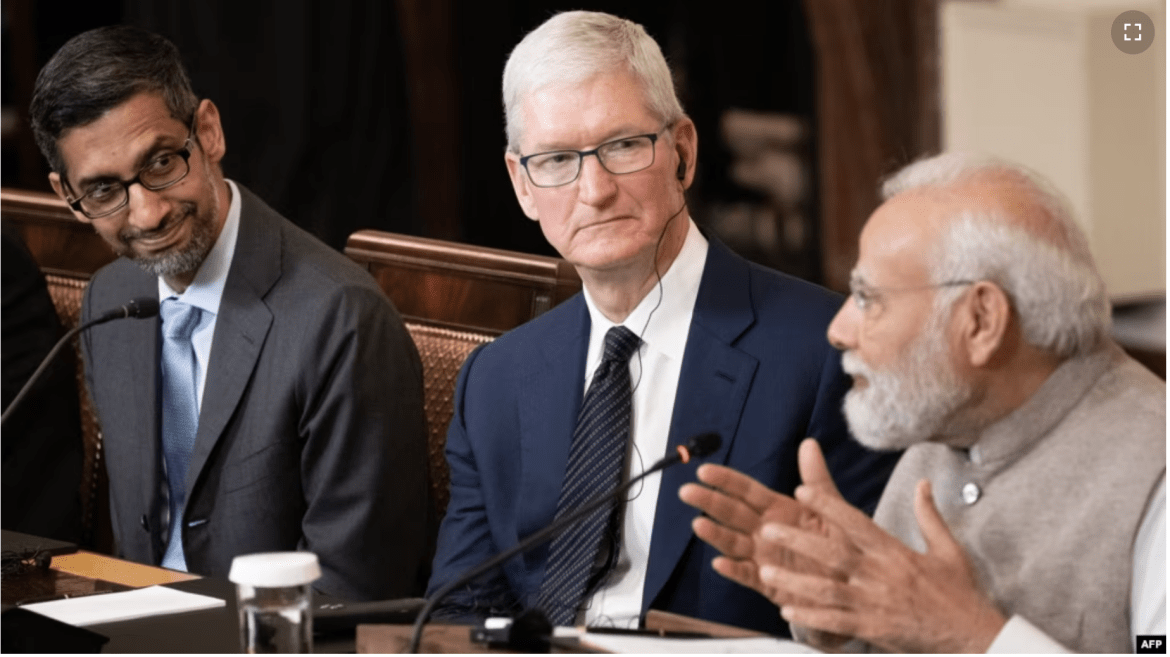 左起:谷歌首席执行官桑达·皮采和苹果首席执行官库克在白宫的一个美印高级商务会议上倾听印度总理莫迪的讲话。(2023年6月23日)