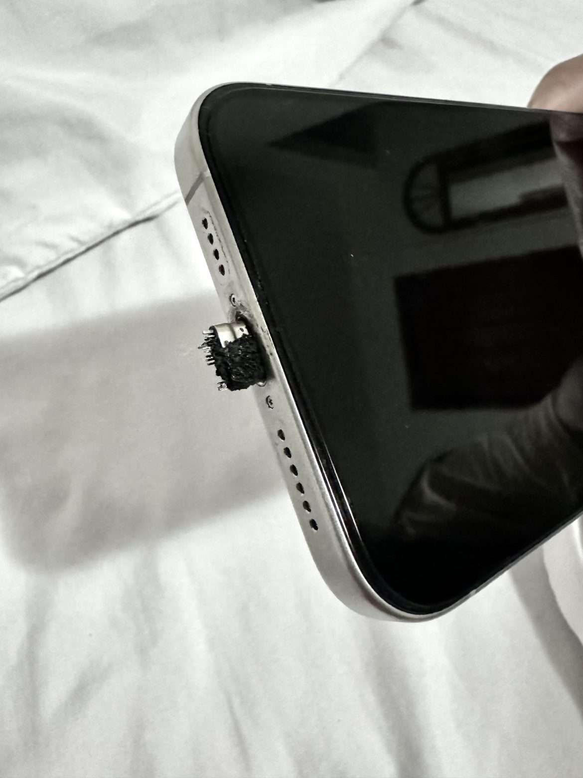 原PO表示,他目前使用这支手机约1个月,并且已经开启最佳化电池充电模式,未料彻夜充电后却发生恐怖灾情,不仅在机身留下烧灼痕迹,甚至拔不出充电线金属头,“我要怎麽除掉这个?此外,这是手机的问题,还是充电线或插头的问题?”