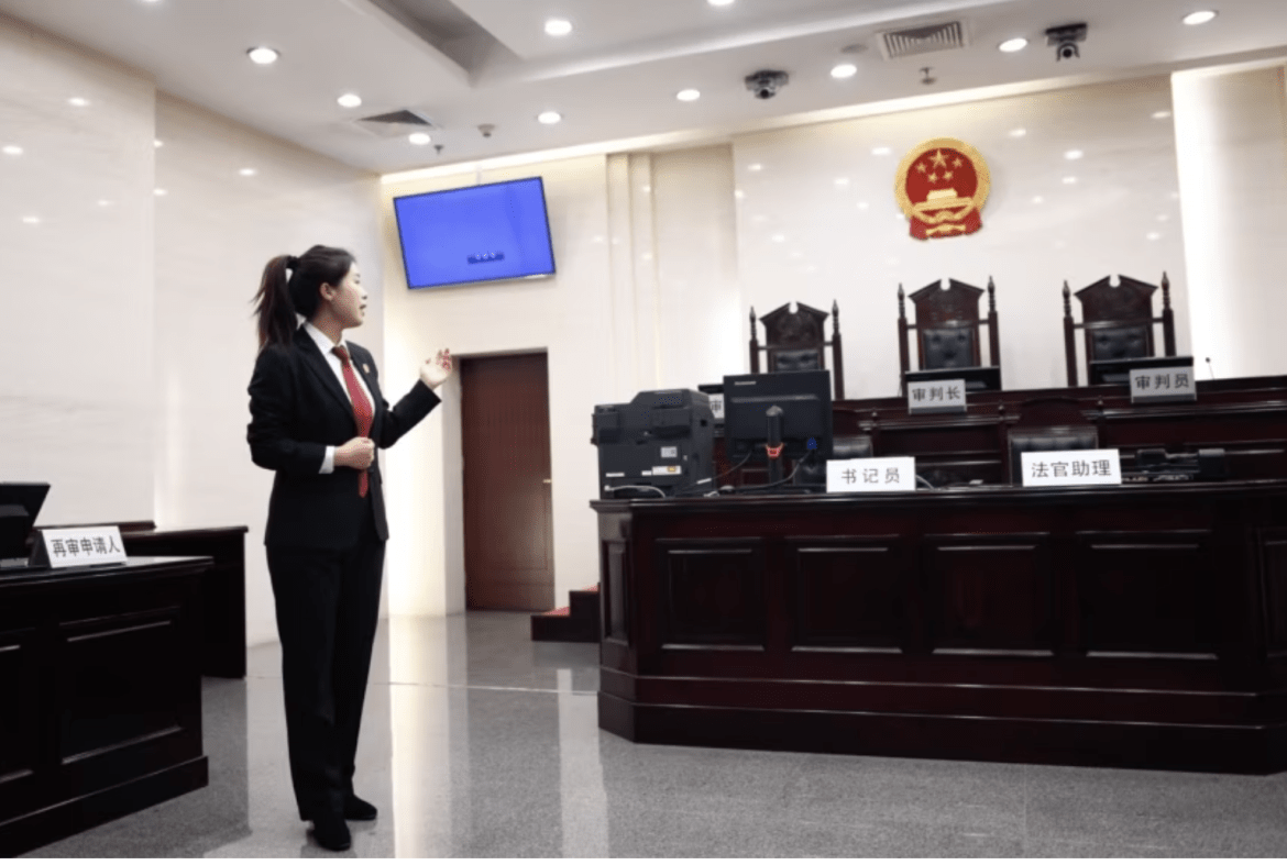 资料照片:一名中国人民最高法院的工作人员站在法庭内向参观者做介绍。(2018年12月20日)