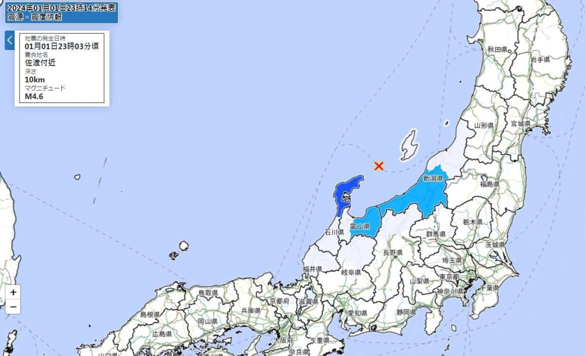 日本气象厅1日晚间发布,石川县能登地区1日晚间11点03分(台湾时间10点03分)发生强震,最大震度7级,不过通报10分钟后(11点13分)随即取消,并于晚间11点14分发布更新资讯,佐渡岛西方海域、石川县能登半岛东部海域1日晚间11点03分发生规模4.6地震,震源深度10公里,最大震度3级。