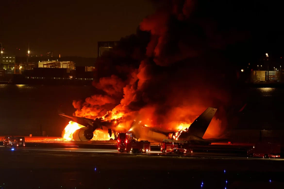 周二,日本航空公司的一架飞机在东京降落时与一架日本海上保安厅飞机相撞,导致客机爆炸起火,并导致了另一架前往地震救援行动的海上保安厅飞机上成员死亡。