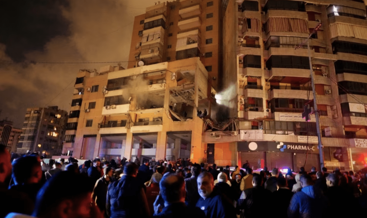 人群聚集在黎巴嫩南郊一座发生了爆炸的大楼外。哈马斯和真主党官员说,哈马斯高级官员阿鲁里被炸死。(2024年1月2日)