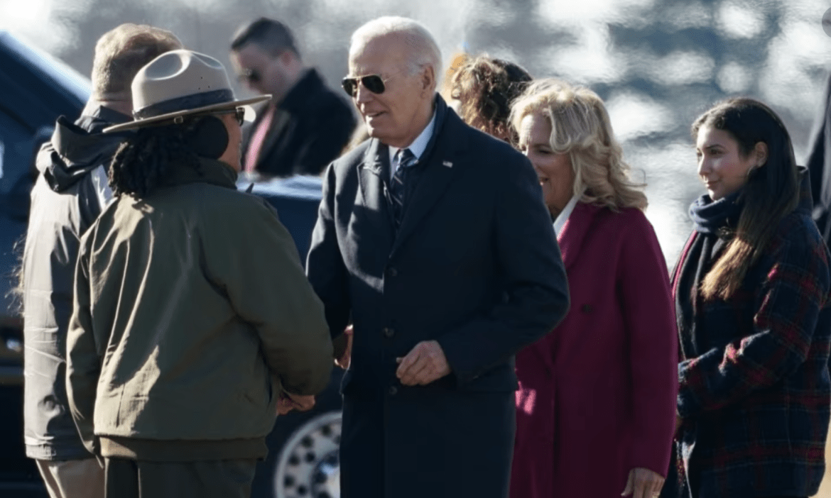 2024年1月5日,美国总统乔·拜登和第一夫人吉尔·拜登抵达宾夕法尼亚州福吉谷附近时向人们致意。