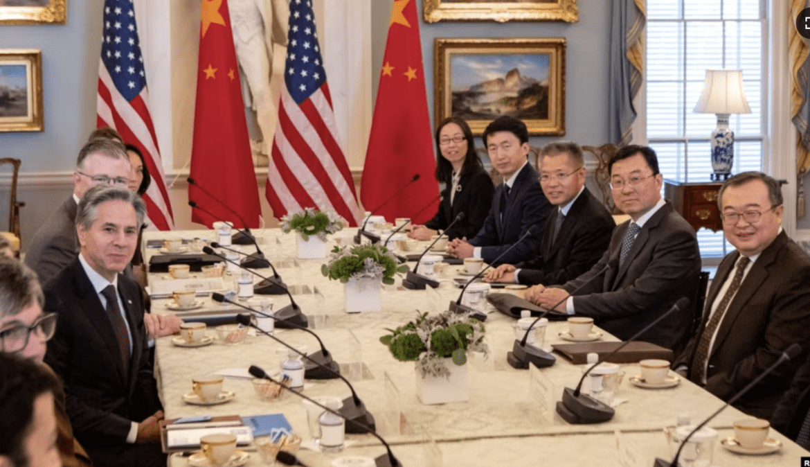 美国国务卿布林肯(左)在华盛顿与中共中联部部长刘建超(右)在华盛顿举行会谈。(2024年1月12日)