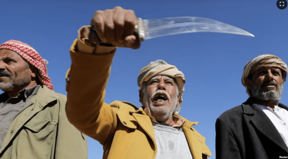 一名举着匕首的胡塞支持者参加最近的一场反美游行