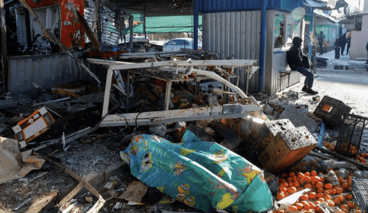 俄罗斯占领的顿涅茨克的市郊一个市场1月21日遭到炮击后的情形。