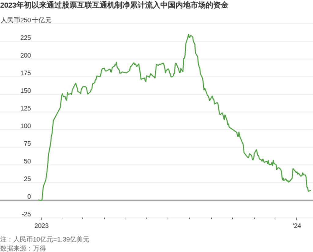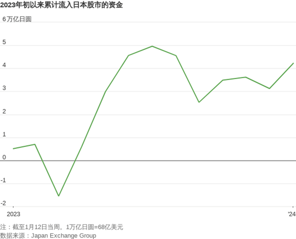 截至1月12日当周,外国投资者净买入了9,560亿日圆(合65亿美元)的日本股票。而在整个2023年,这些投资者的净买额在3.1万亿日圆左右。另一方面,2024年以来,包括在香港的投资者在内的外国投资者已经通过内地和香港交易所之间的股票互联互通机制净卖出了约人民币300亿元(合42亿美元)在沪深两市交易的股票。