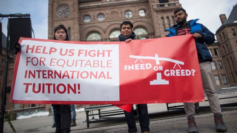 一群在加拿大的国际学生及其支持者手持标语,呼吁人们关注该群体面临的几个问题,包括狭窄且昂贵的住房、高昂的学费、雇主的剥削以及获得永久居留权的艰难途径。