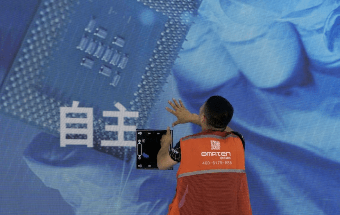 一名工人在上海举办的世界人工智能大会上检查中国科技公司中科曙光展示的芯片和自主字样的屏幕。(2023年7月5日)